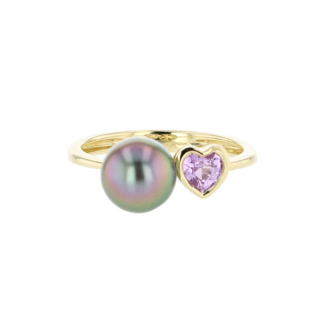Hinerava’s Poésie Collection presents this romantic ring, set in 14KY, that combines the brilliance of a pink, heart cut sapphire, 0.40ct, with the timeless elegance of a Tahitian pearl.