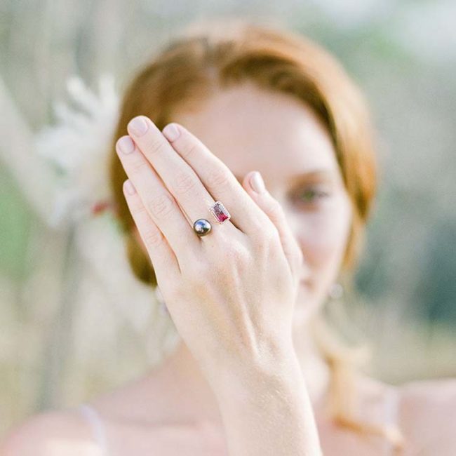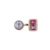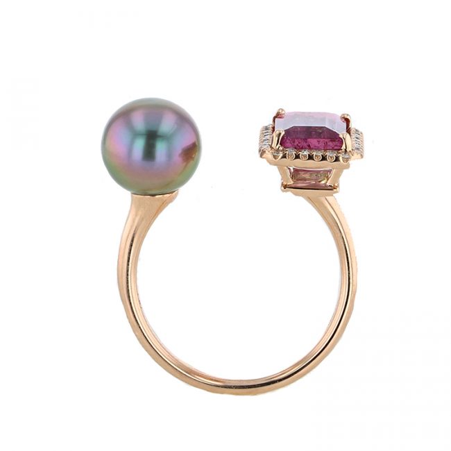 Hinerava’s Poésie Collection features an exceptional open ring made with a lustrous Tahitian Pearl carefully choosen to match an exquisite pink-purple tourmaline, 2.21 carats, adorned with diamonds, 0.11 carats, set in 14K yellow gold. A quintessential Hinerava design that is romantic and ever so elegant.