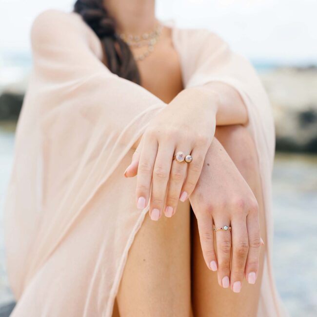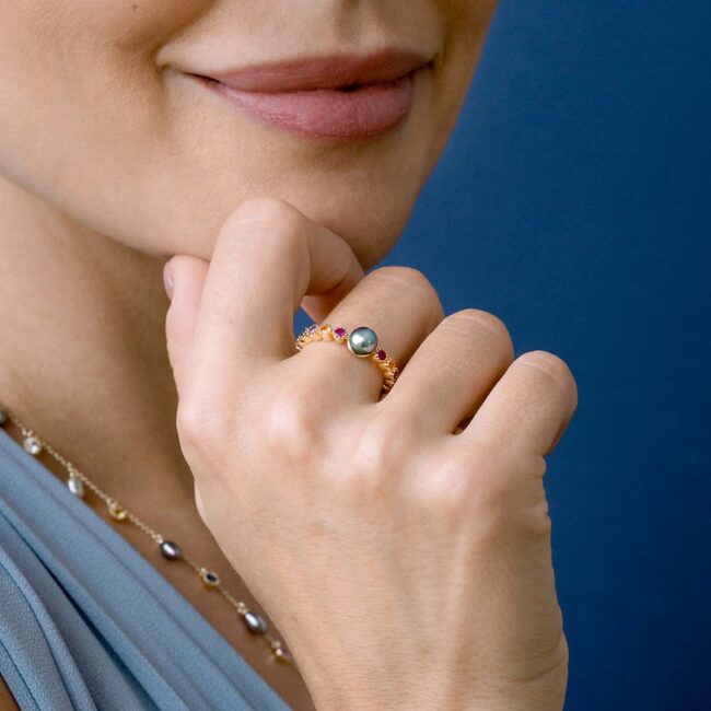 Hinerava’s Poésie Collection presents an exquisite ring made of a selection of colored sapphires, 0.56 carats, complemented with a lustruous Tahitian keshi. This rainbow of sapphires ring is set in 14K yellow gold. A quintessential Hinerava design expressing discreet romanticism and elegance.
