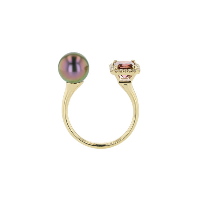 Hinerava’s Poésie Collection introduces a sumptuous open ring made of a pale red emerald cut tourmaline, 1.0 carats, haloed with brillant diamonds, 0.07 carats, and a lustruous Tahitian pearl carefully chosen to complement the tourmaline. This in-between-the-finger style ring is set in 14K yellow gold. A quintessential Hinerava design that is romantic and ever so elegant.