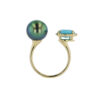 Hinerava’s Poésie Collection presents an exquisite ring made with alternating turquoise and lapis lazuli gems, symbolically representing the hues of our Polynesian ocean and lagoons. This ring is complemented with a lustruous Tahitian keshi and set in 14K yellow gold. A quintessential Hinerava design expressing discreet romanticism and elegance.
