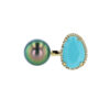Hinerava’s Poésie Collection presents an exceptional open ring made with a unique turquoise gem, 2.51 carats, haloed with brillant diamonds, 0.1 carats, and a lustruous 9 to 10mm Tahitian pearl carefully chosen to complement the turquoise. This in-between-the-finger style ring is set in 14K yellow gold. A quintessential Hinerava design that is romantic and ever so elegant.