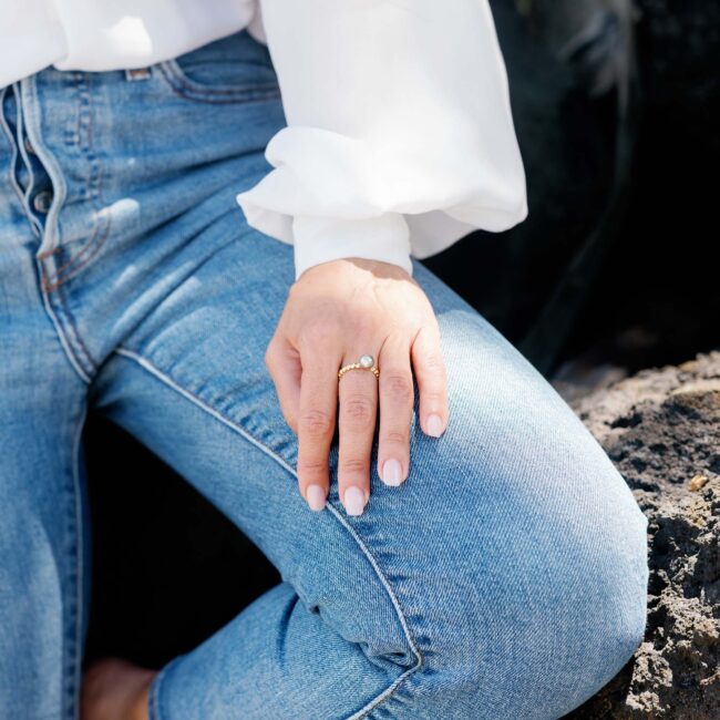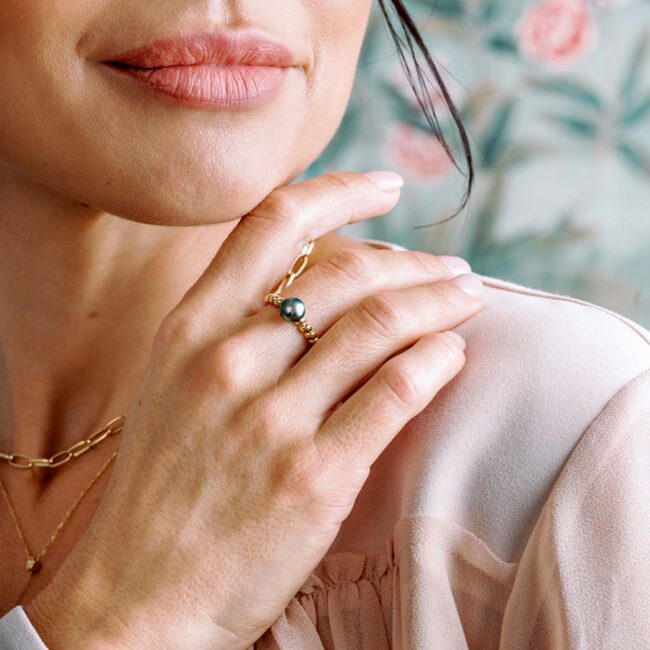 Hinerava’s Signature Collection features a quintessential classic twist ring set in 14K yellow gold, with a flawless Tahitian keshi pearl. This minimalistic ring makes the perfect everyday accesory and looks great as part of a stack.