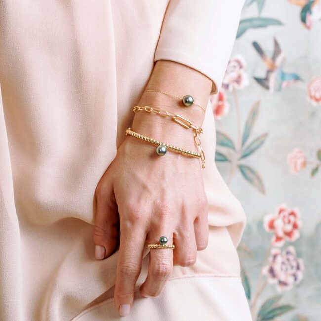 Hinerava’s Signature Collection features a delicate twist bangle with a single 8mm Tahitian pearl, set in 14K white gold. This elegant bracelet is perfect for mixing, matching, and layering.