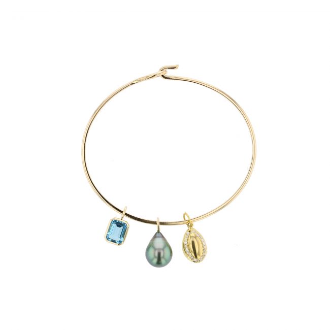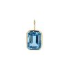 Hinerava presents this lovely blue topaz charm in an emerald cut 6x8mm and weighing 1.73 carats, set in 14K yellow gold. Blue topaz is a stone of peacefulness, loyalty and love. In addition to these qualities, we selected this gem as part of our collection for its striking blue color reminiscent of our lagoons.
