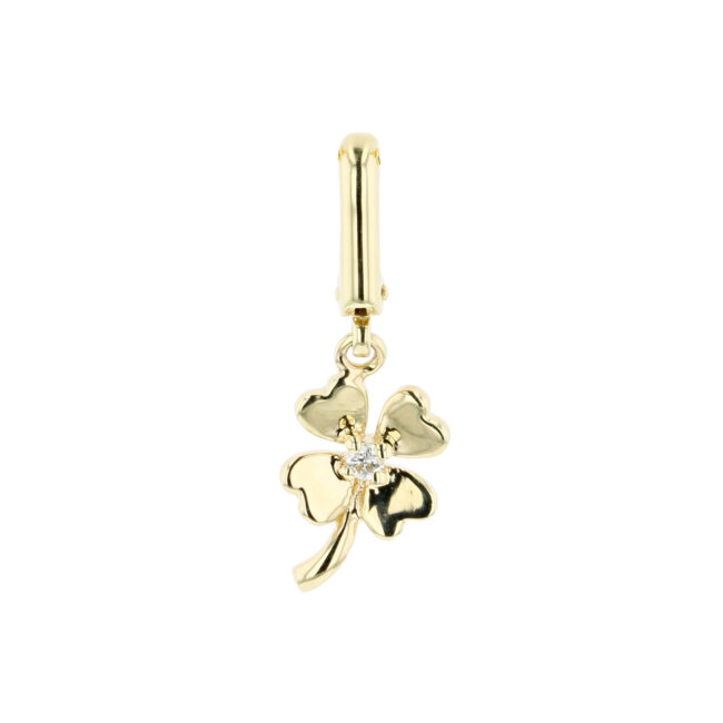 Hinerava’s Coquina Collection presents a four-leaf clover charm with a diamond center, 0.07 carats, and set in 14K yellow gold. The four-leaf clover symbolizes faith, hope, love and luck. This charm is mounted on a clip for versatility.