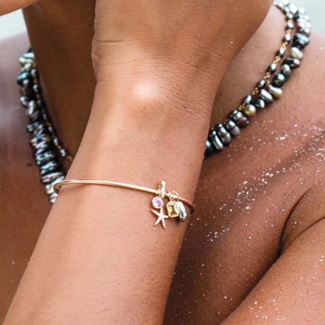 Hinerava presents this darling pink sapphire charm in a round cut measuring 4mm in diameter and weighing 0.31 carats, set in 14K white gold. Pink sapphire symbolizes trust and sincerity, while also evoking intense love. Its soft rosy hue reminds us of plumerias and pale pink hibiscus. This charm complements one of our infant bangles well and adds a touch of sparkle to your little one’s precious set.