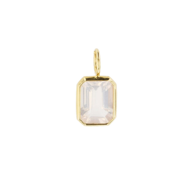 Hinerava presents this rose quartz charm in an emerald cut measuring 6x8mm and weighing 1.34 carats, set in 14K yellow gold. Rose quartz speaks softly to all kinds of love. We love this stone as its pastel rosy hue reminds us of plumerias and pale pink hibiscus.