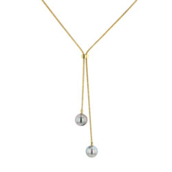 Hinerava’s Signature Collection features an adjustable “Toi & Moi” Tahitian pearl lariat necklace in 18K yellow gold. The rare and carefully selected 15 mm Tahitian pearls are beautifully contrasting while two gold center bars allow for the length of the necklace to be adjusted in the front and in the back (total length is 32 inches).