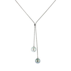 Hinerava’s Signature Collection presents an adjustable “Toi & Moi” lariat necklace, crafted in 14K white gold and adorned with two rare 11 mm Tahitian pearls. Carefully selected for their striking contrast, the pearls embody the harmony of duality. Two elegant gold center bars allow the necklace to be adjusted both at the front and back, offering versatile styling across its graceful 32‑inch length.