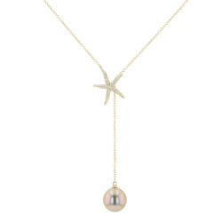 Hinerava’s Signature Collection presents its striking starfish adjustable pearl necklace, featuring a sliding starfish with pavé white diamonds, 0.15 carats, which allows for length versatility, and finished with an exquisite 8-9mm Tahitian pearl. This simply sophisticated necklace set in 14K yellow gold, is minimalistic and always elegant. Lenght: 60 cm.