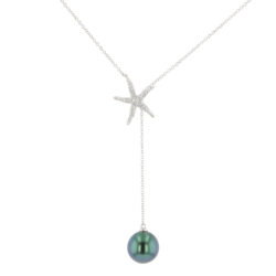 Hinerava’s Signature Collection presents its striking starfish adjustable pearl necklace, featuring a sliding starfish with pavé white diamonds, 0.15 carats, which allows for length versatility, and finished with an exquisite 8-9mm Tahitian pearl. This simply sophisticated necklace set in 14K white gold, is minimalistic and always elegant. Lenght: 60 cm.